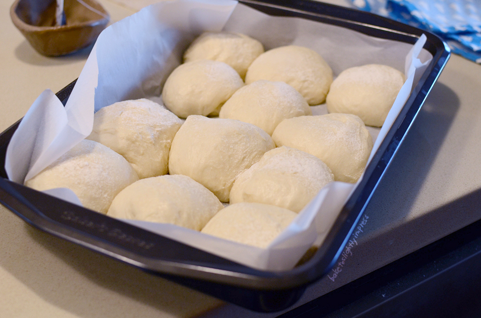 5. Line a baking tray with some parchment paper and put the little dough balls into it. Cover and let it proof for around 50mins to an hour and a half. Until they sorta fill the tray up and touching each other.