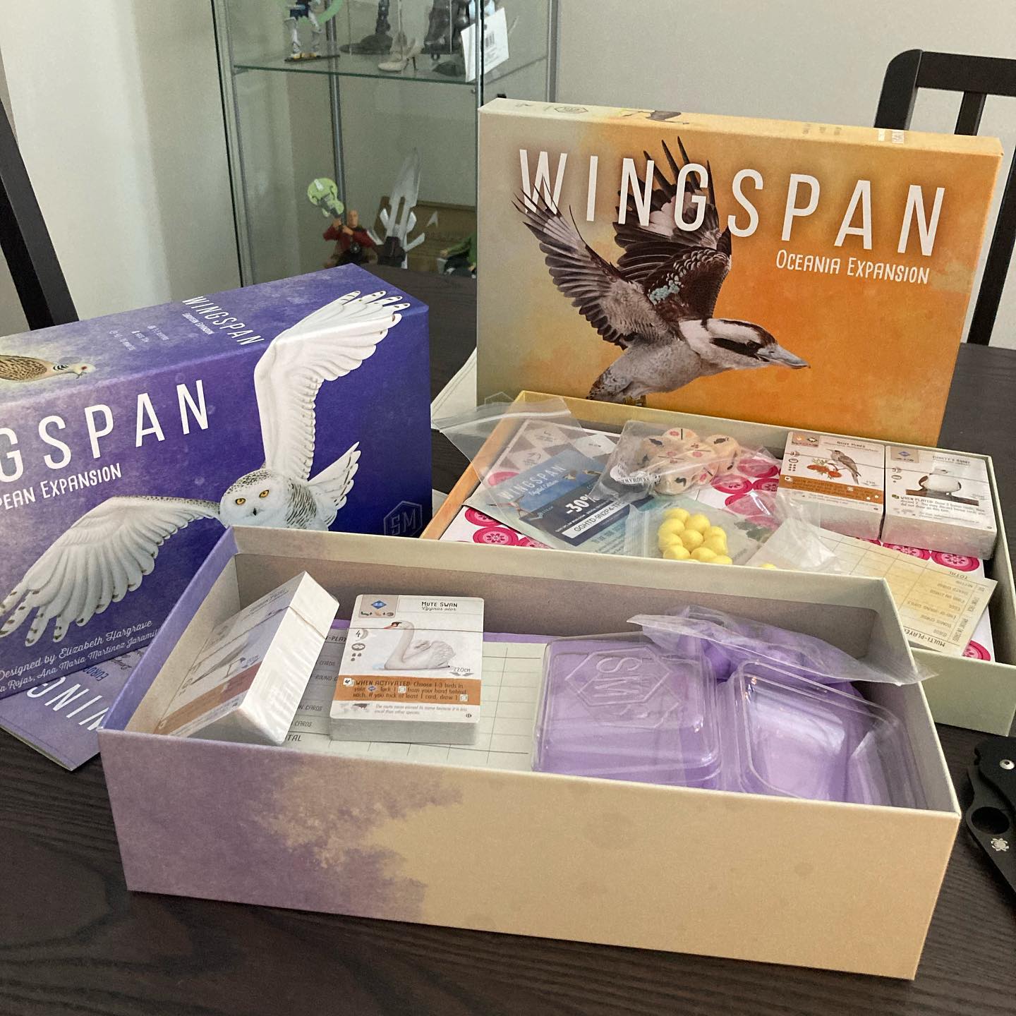 Today’s enrichment features: wingspan: the expansions. So pretty!!! So many beautiful new cards! And forgetting to order new card sleeves to sleeve them!