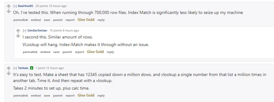 From r/excel, bunch of people arguing which function is superior and what test they have ran to determine the difference in computation speeds. NERDS! You all have a very special place in my heart <3